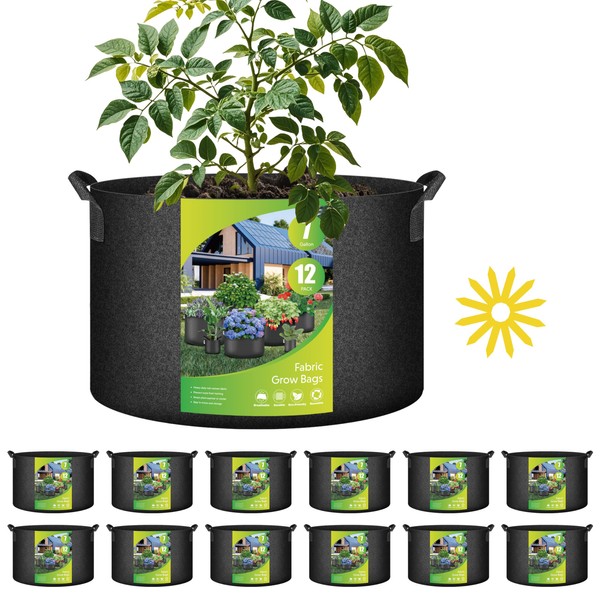HealSmart 7 Gallon 12 Pack Nonwoven Grow Bags, Aeration Fabric Pots with Handles, Heavy Duty Garden Grow Pots for Tomato Vegetables Flowers, 12 Plant Labels, Black