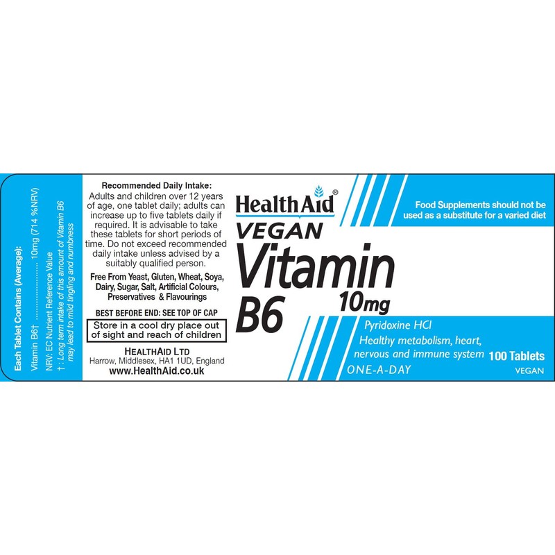 Health Aid Vitamin B6 (Pyridoxine HCl) 10mg 100 Tablets