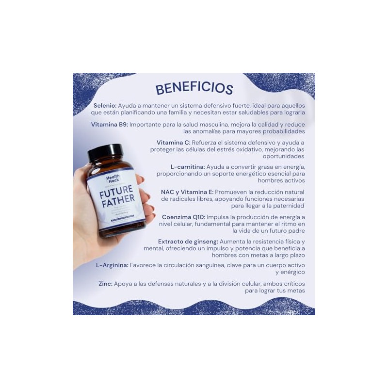 - Acerca de este artículo 👨👩👦【BENEFICIOS CLAVE DEL PRODUCTO】: Apoya tu camino hacia la paternidad con "Future Father". Este suplemento está diseñado para apoyar la vitalidad masculina utilizando ingredientes naturales como Zinc, Vitamina C, Vitamina E, y Selenio. Cada cápsula está formulada para ayudarte a mantener un estado óptimo, proporcionando una base sólida para tu futuro. 🌟【APOYO HOLÍSTICO】: "Future Father" de Health Hack es más que un suplemento; es tu aliado en la búsqueda de bienestar y vitalidad. Con nuestra fórmula única que incluye CoQ10, L