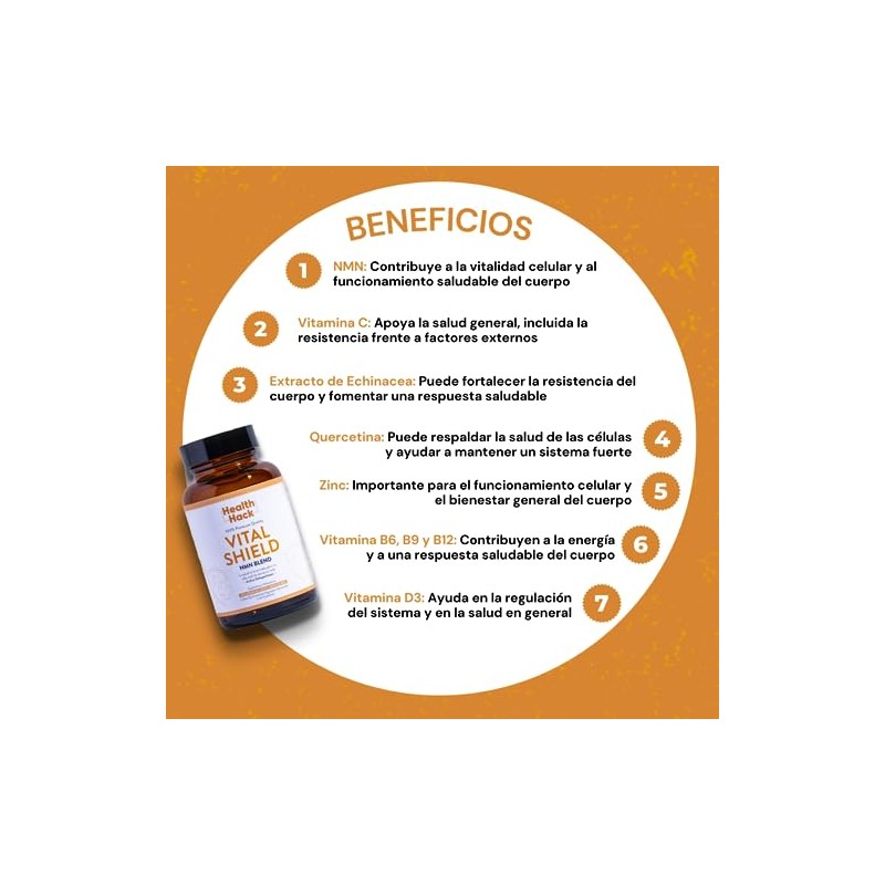 - EL CENTRO DE TU DEFENSA】El NMN (Nicotinamida Mononucleótida) es el corazón de Vital Shield. Actuando como un catalizador en la salud celular, mejora la resiliencia y fortaleza del cuerpo, preparándote para enfrentar los desafíos diarios. Su impacto en la vitalidad es profundo, lo que lo convierte en una pieza central en este suplemento diseñado para proporcionarte el escudo que necesitas, además actuando como anfitrión del envejecimiento saludable. 🌿【FORTALECIMIENTO NATURAL】Health Hack Vital Shield NMN Blend ofrece un fortalecimiento único y natural. Estos ingredientes botánicos, conocidos por sus propiedades beneficiosas, se combinan para ofrecerte una barrera robusta y natural. Junto con el NMN, trabajan para potenciar tu vitalidad y resistencia, ayudándote a mantener un equilibrio y bienestar óptimos. 💊【VITAMINAS ESENCIALES】Este suplemento no es solo NMN; contiene una mezcla robusta de vitamina C, zinc, y las vitaminas B6, B9, B12, y D3. Estos elementos trabajan en sinergia para promover la fortaleza corporal, ofreciendo una nutrición completa y diversa que complementa tu dieta. Desde la vitalidad diaria hasta el apoyo en situaciones más desafiantes, estas vitaminas son esenciales en tu camino hacia el bienestar. 🌞【APOYO CONSTANTE】Vital Shield NMN Blend es ideal para aquellos que buscan mantenerse fuertes y activos en su día a día. Su fórmula cuidadosamente con vitamina C seleccionada se integra perfectamente en cualquier rutina, proporcionando un soporte constante y confiable. Ya sea que estés en la oficina, en casa, o practicando tu deporte favorito, este suplemento es tu aliado, brindándote la energía y resistencia que necesitas. 🔐【GARANTÍA DE HEALTH HACK】Nos encanta y nos enorgullece nuestro producto por lo que respaldamos esto con una garantía de devolución total si no obtienes resultados en 3 semanas. Tenga la confianza de que este producto contiene los ingredientes naturales que son principales y necesarios para nutrir tu sistema cognitivo. Cualquier duda, pregunta o sugerencia no dude en contactarnos por nuestras redes. Ordene ahora y tenga la seguridad de que este producto estará a la altura de sus expectativas.