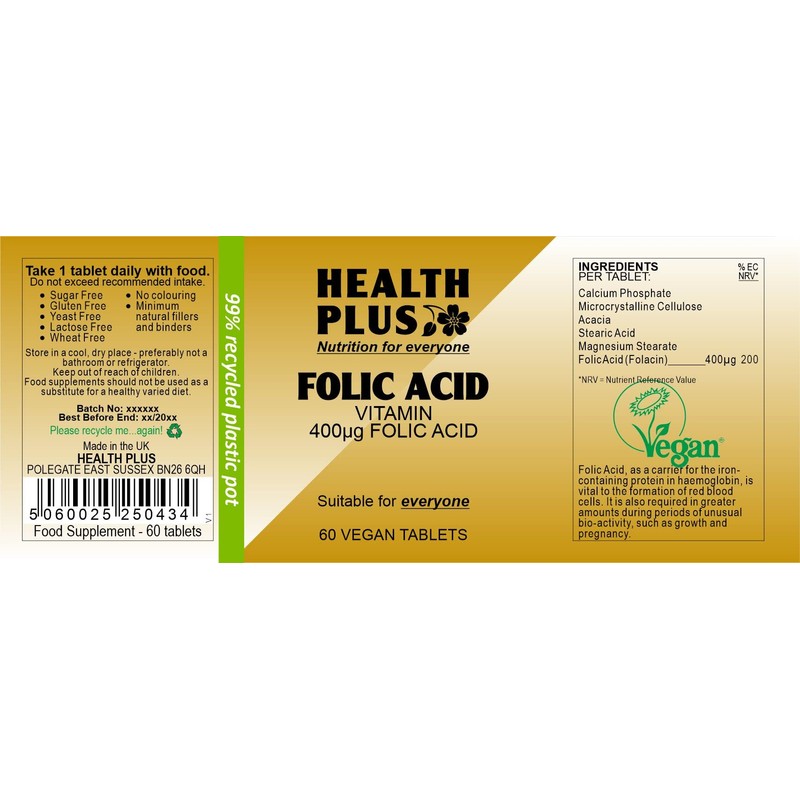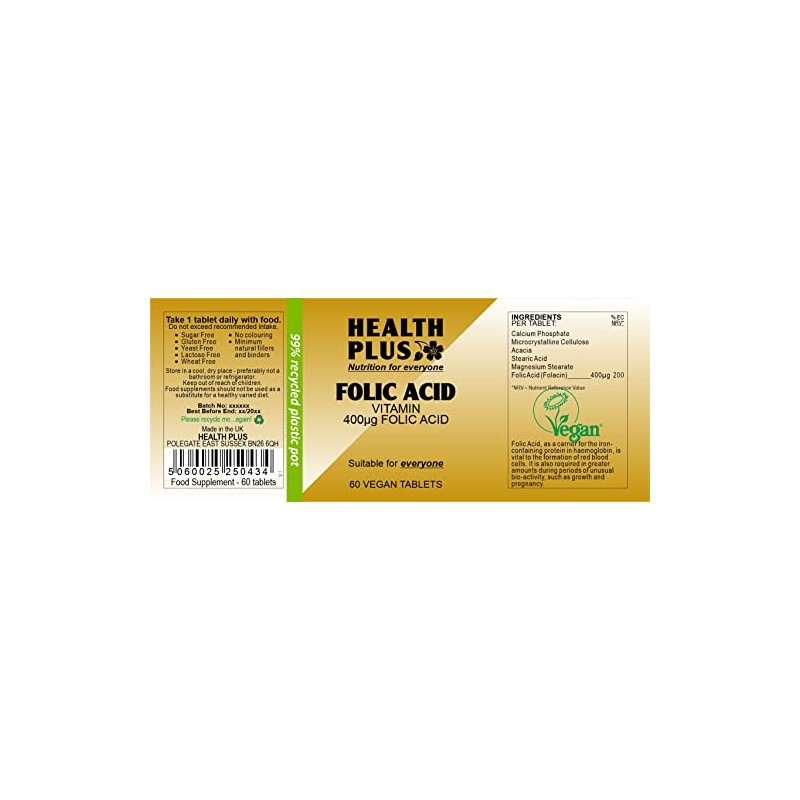 Health Plus Folic Acid 400µg : Pre-Conceptual Vitamin B Supplement : 60 Tablets, in a Planet-Friendly 99% Recycled Pot