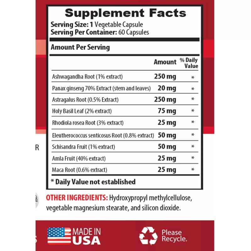 - Active Ingredients: Ashwagandha, Panax ginseng Root, Astragalus Root, Holy Basil Leaf, Rhodiola rosea Root, Eleutherococcus senticosus Root, Schisandra Fruit, Amla Fruit, Maca Root