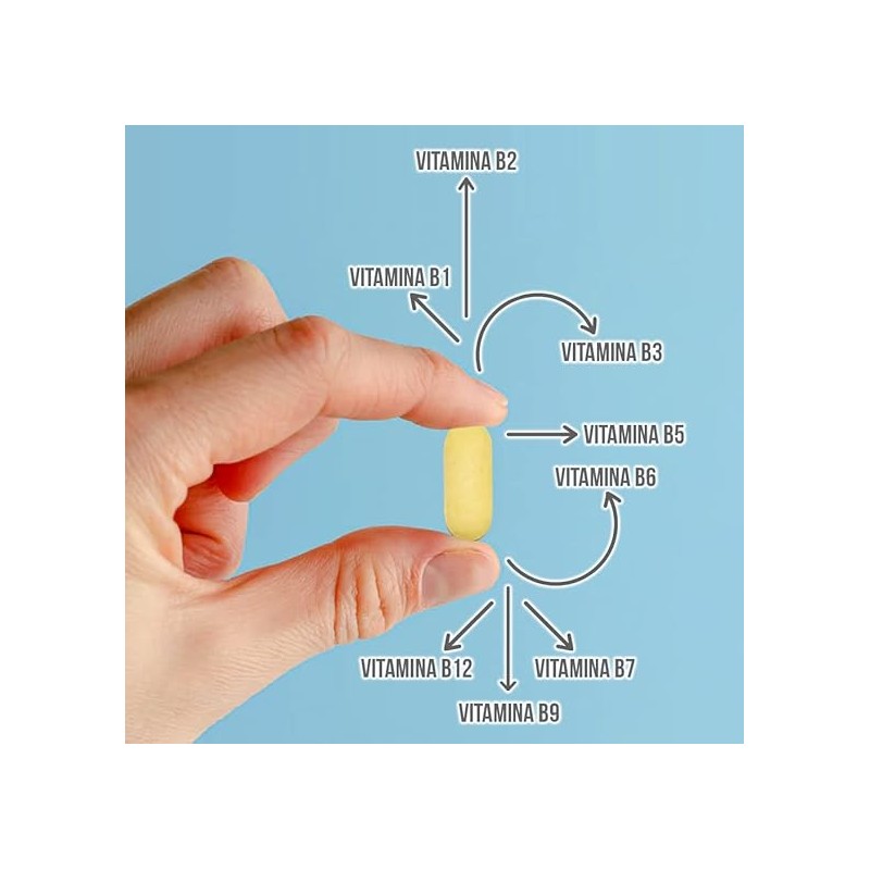 - Complejo B Completo - Obtén un impulso total con todas las vitaminas esenciales del complejo B, incluyendo B1, B2, B3, B5, B6, B7, B9 y B12 para un óptimo bienestar.