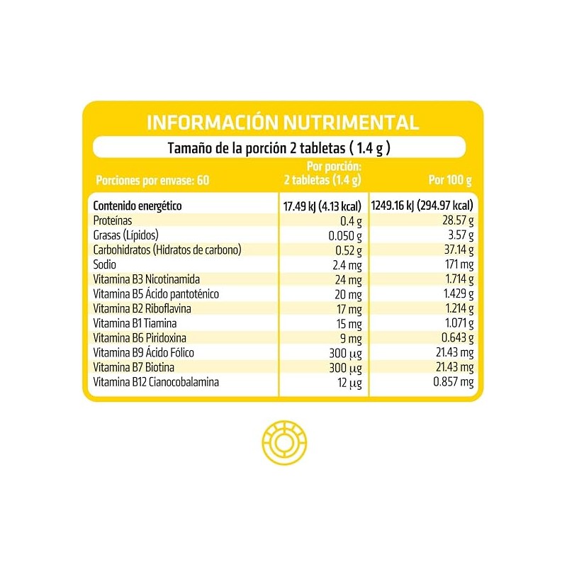 | Ingredientes | Complejo B (B1, B2, B3, B5, B6, B7, B9 y B12) |