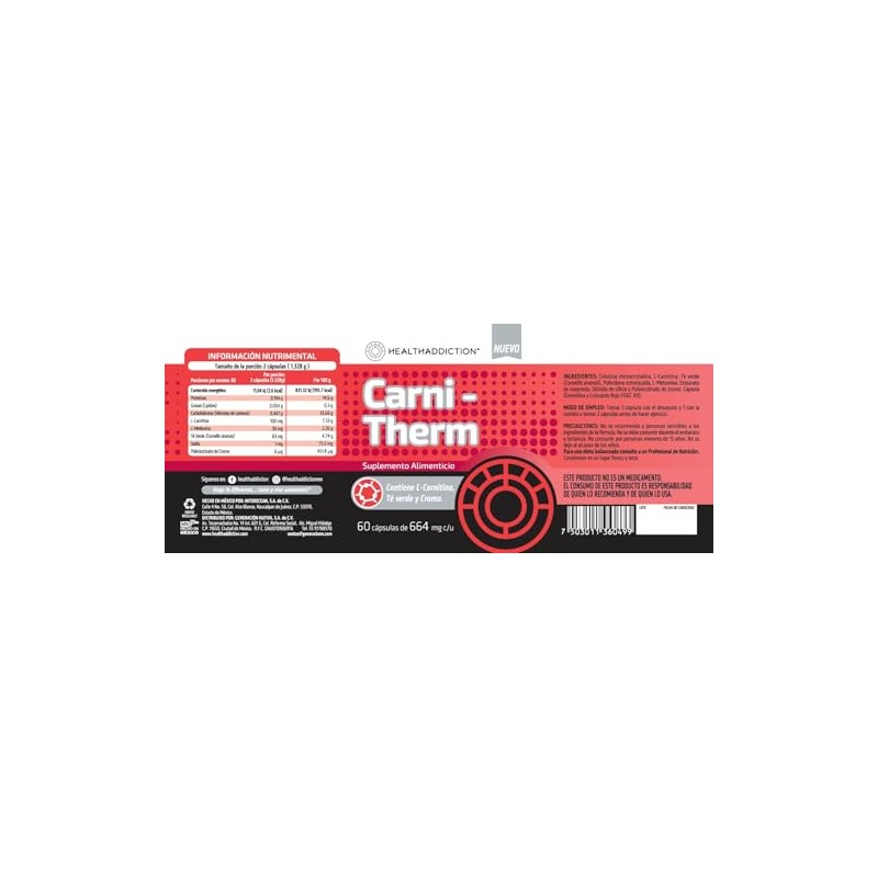 - Descubre el poder de HealthAddiction Carnitherm, un suplemento alimenticio termogénico diseñado para impulsar tu rendimiento deportivo. Su fórmula única incluye ingredientes clave como L