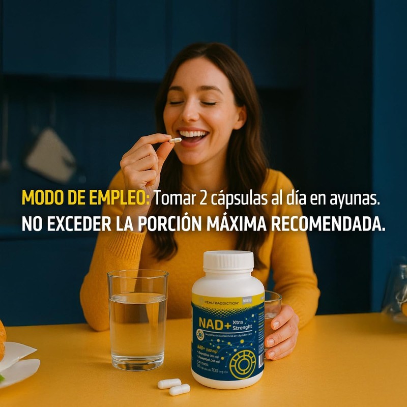NAD+ Xtra Strength de Healthaddiction es un suplemento alimenticio formulado con ingredientes de alta calidad. Cada porción aporta 500 mg de NAD+, acompañado de 200 mg de Quercetina y 200 mg de Resveratrol. Su presentación en cápsulas de 700 mg facilita su consumo diario. Esta fórmula está libre de gluten, sin azúcares añadidos ni saborizantes artificiales, lo que la convierte en una opción práctica para quienes buscan complementar su alimentación con nutrientes funcionales. Ideal para integrarse a un estilo de vida equilibrado, con el respaldo de una marca comprometida con la innovación y la calidad. Producto sin propiedades terapéuticas.