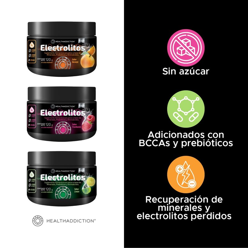 HEALTHADDICTION - Polvo de Electrolitos con BCAA's, Prebióticos y Vitamina B, Sin Azúcar ni Calorías, Bajos en Sodio, 120g - Sabor Limón