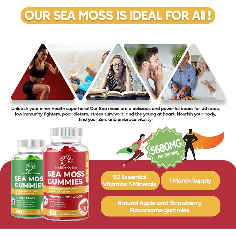 Healthier Options Irish Sea Moss Gummies with Bladderwrack & Burdock Root 5680 Mg | 60 Gummies | Strawberry Flavour | Vitamins & Minerals | Organic, Natural, Vegan, Gluten Free, Non GMO, High Strength
