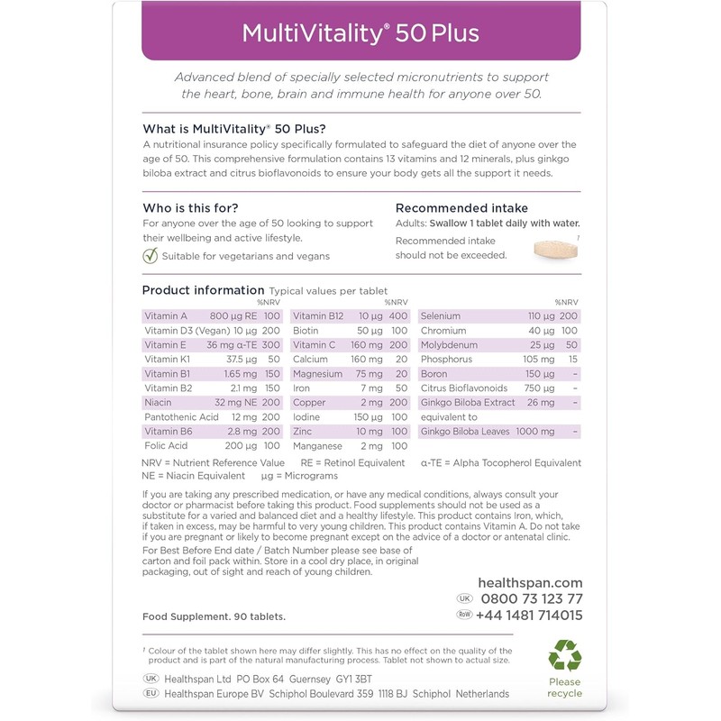 Healthspan Multivitamin 50 Plus | Advanced Multivitamin for Over-50s with 13 Vitamins & 12 Minerals | Includes Ginkgo Biloba & Citrus Bioflavonoids | Supports Immune, Brain, Heart & Bone Health | Vegetarian | 180 Tablets