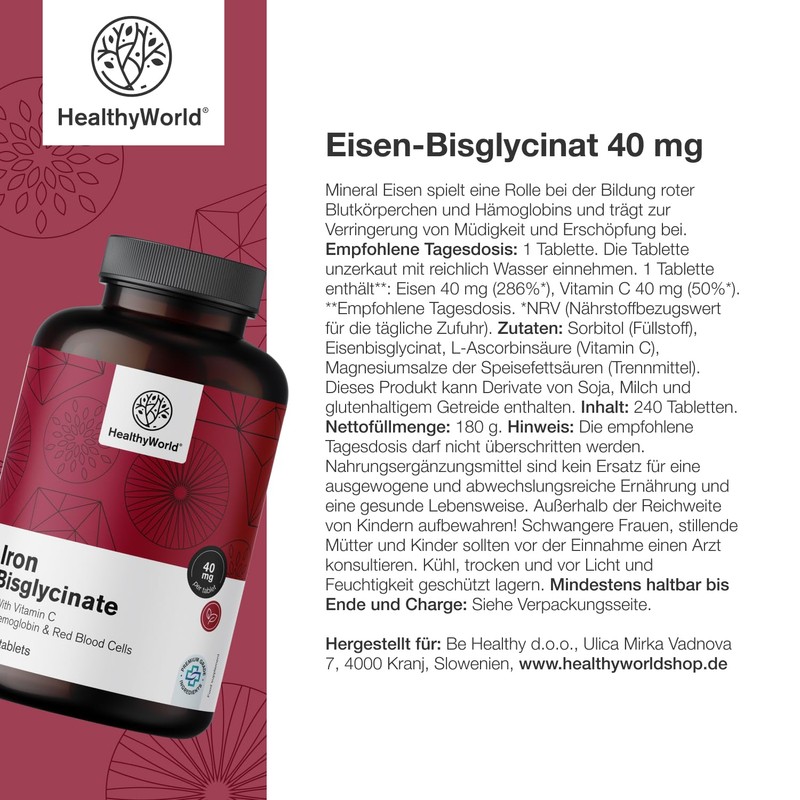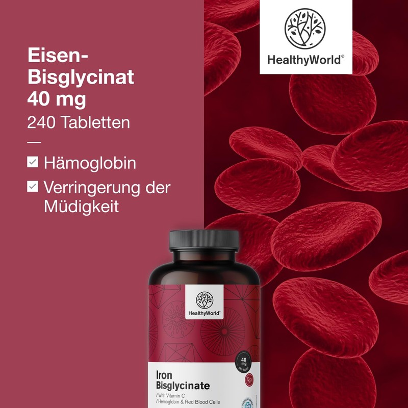 HealthyWorld® Iron Bisglycinate 40 mg - With Vitamin C - 240 Tablets - 8 Month Supply - No GMOs and No Artificial Colours - 40 mg Iron, 40 mg Vitamin C - Highest Quality