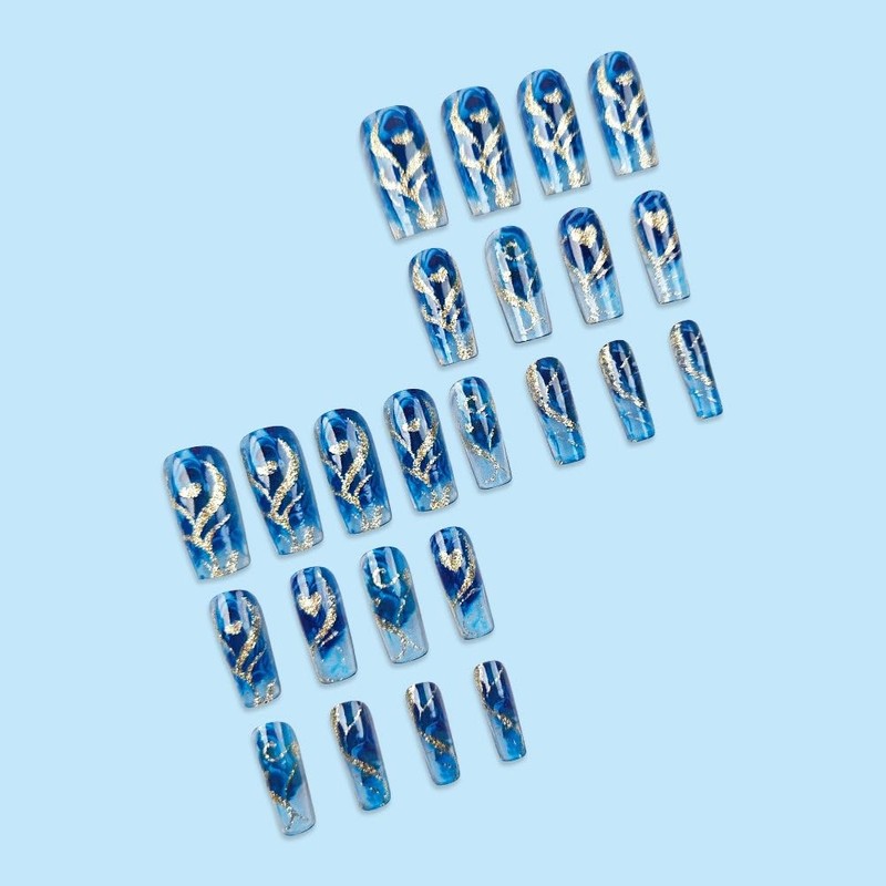 Heart Acrylic Nails Blue Gradient Press on Nails Square Wave Silvery Flowers Stripe Pattern Design Nails Artificial Coffin Nails Glossy Glue on Nails for Women