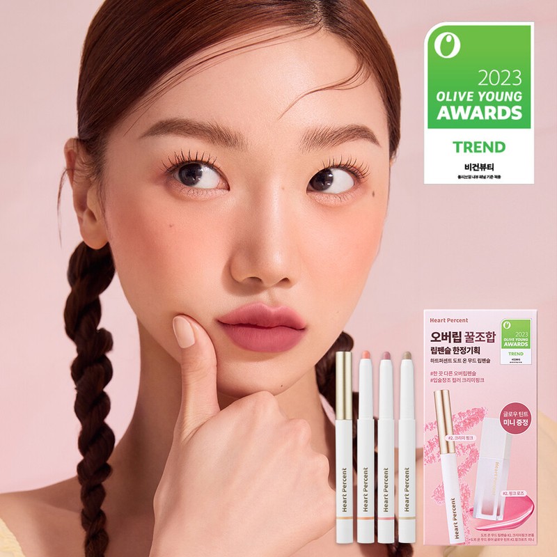 99% satisfaction in overlined lip expression, willingness to recommend to others, and lip pencil color. 98% satisfaction in overall product, 97% satisfaction in willingness to repurchase, 96% satisfaction in lip base expression, 95% satisfaction in lip pencil adherence, and 90% satisfaction in lip pencil long-lasting effect. Overlined lip pencil that gives extra point. Provides plump overlined lip expression including lip base, expansion, and contouring makeup. The perfect smudging provides excellent overlined lip and the texture is completely fixed to give long-lasting pretty lips. Heart Percent presents various unique shades for all skin tones. The smooth texture is smoothly smearing even on the lips. 4-in-1 multi pencil for lip liner, lip base, contouring and cheek makeup. Provides perfect lip line, customized lip base to correct dark lip shade, contouring on different skin tones, and watercolor like cheek makeup. This product is certified by French EVE Vegan.