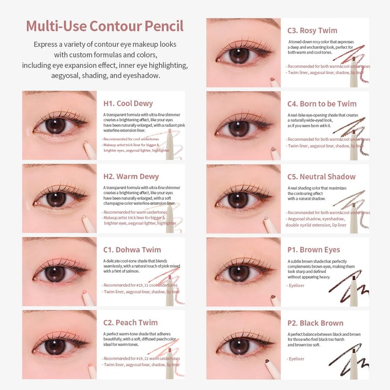 - [Multi-Use Contour Pencil] Versatile for creating bigger eyes, aegyo-sal, shadow, and shading. Express a variety of contour eye makeup looks with custom formulas and colors, including eye expansion effect, inner eye highlighting, aegyosal, shading, and eyeshadow.