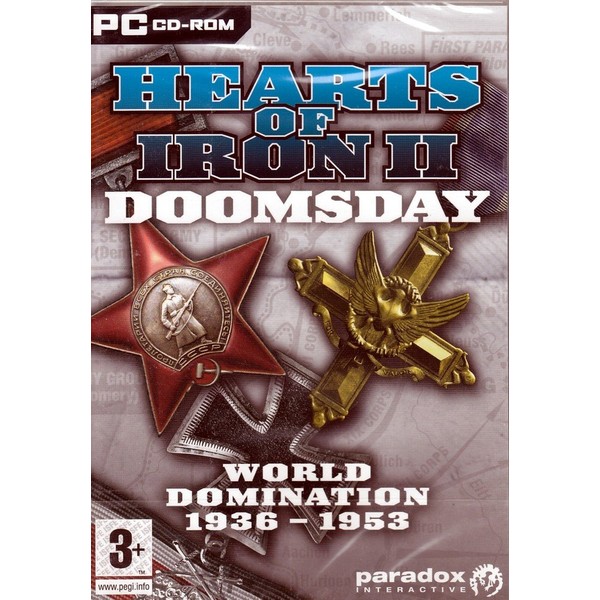 World Domination 1936-1953Product InformationExpand your World War II experience in Hearts of Iron II Doomsday. Asthe German war machine falls two great nations rise to claim power. In theWest there is the United States leader of the allied nations and in the Eastlies the Soviet Union under munist rule. As both nations attempt to claimsuperiority a new war is waiting around the corner; this time the conflictwill decide who will be the remaining superpower.Play as the ruler of one of 175 countries through World Wars II and III. As theAllies and the Soviet Union clash in Europe the fate of the world hangs in thebalance.Product Features World War III scenario with an alternative historical oute. Play the Soviet alliance the United States or any country of your choice as new superpowers rise to power on the global stage. Expanded tech trees with considerable detail in a new decade of warfare allowing you to develop tactical nukes and other kinds of nuclear warfare as well as helicopter squads Escort carriers and much more. Improved Diplomatic/Intelligence System reflects the increased political tension of the 1950s. Complete scenario editor.Windows Requirements Windows 98 Me 2000 XP Pentium III 800 MHz processor 128 MB of RAM 1 GB Free Hard Drive Space 4 MB Video Card DirectX Compatible DirectX Compatible Sound Card DirectX 9.0 or higher (included on the CD) CD-ROM drive