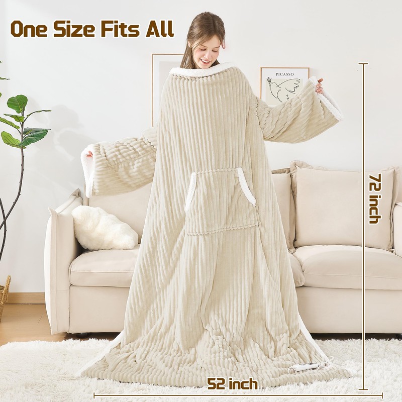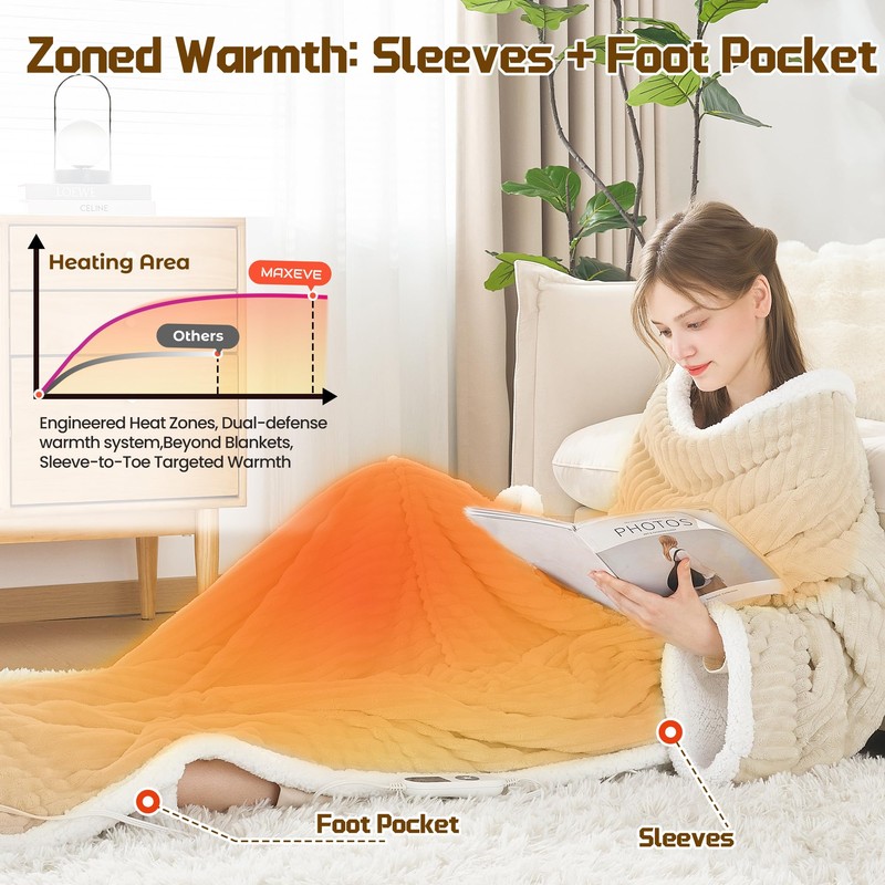 - Heated Wrap Blanket: MAXEVE wearable heated blanket is designed with a convenient foot pocket and sleeves. We also added a button design to prevent the robe from falling off during activities like work, housework, or relaxation. The size of 50*70 inches is perfect, it keeps every part of your body warm, whether it's your hands or feet