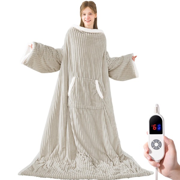 Heated Wearable Electric Blanket with Sleeves & Foot Pocket, Stripe Fleece Sherpa, 6 Heat Levels 12H Timer Setting, Over-Heat Protection, Machine Washable, 52x72 Inches Gray for Office/Home/Gift