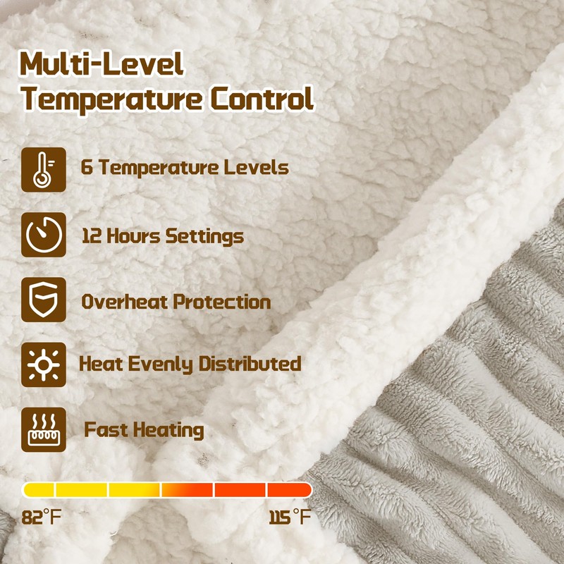 - Electric Throw Blanket: MAXEVE electric blanket has 6 Heating levels and delivers heat ranging from 82-115℉, provide you with the most suitable temperature, meet the needs of different people. It default duration is four hours when you turn on(To ensure safe use, you cannot automatically adjust the time after opening it). Please read the instructions carefully before use to avoid local overheating caused by improper use
