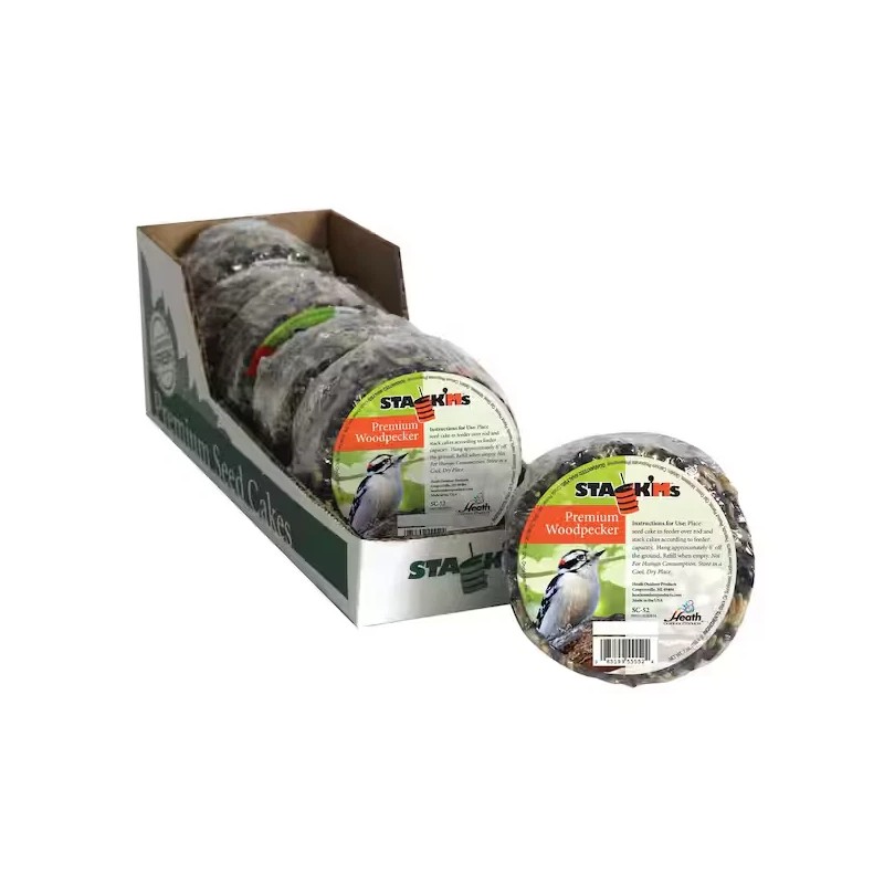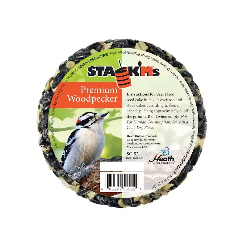 The Heath Outdoor Products Woodpecker Stack'Ms Seed Cake is a 7 oz. cake that features black oil sunflower seeds, peanuts and white millet. Our Stack'Ms seed cakes are specially blended to help you attract several types of birds to the same feeder. Mix and match flavors to find the perfect combination for your yard. Simply stack Stack'Ms on your Stack'Ms feeder, where they will be easily accessible to birds but sheltered from the elements. Guaranteed fresh.