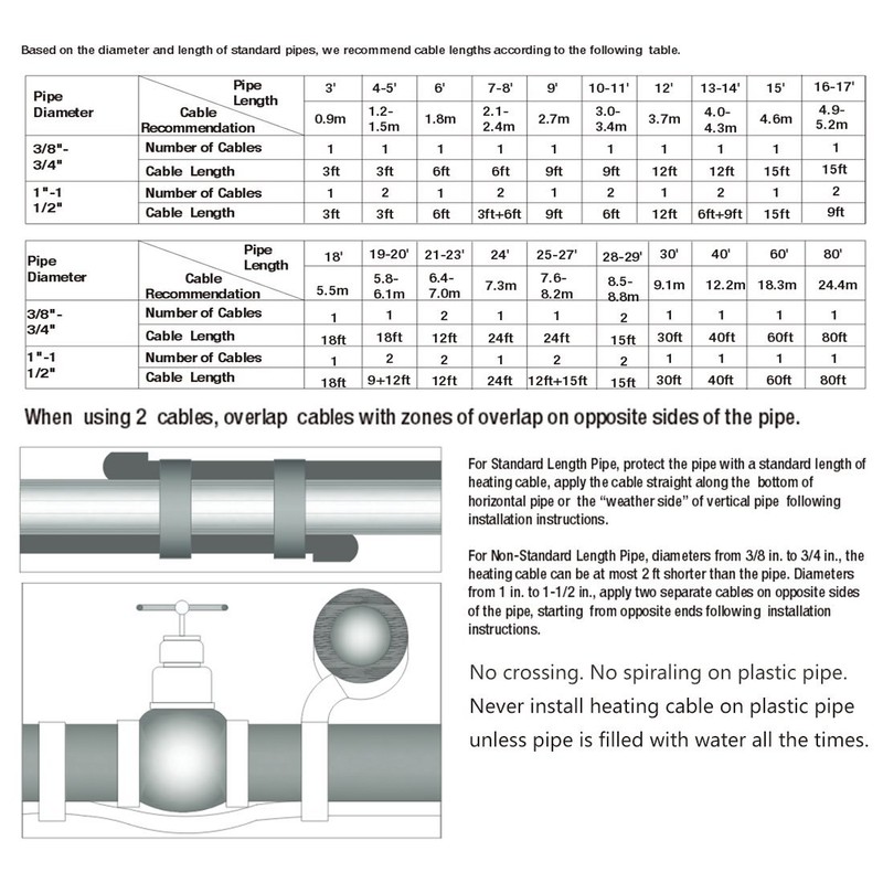 - Maximum 1/2 in fiberglass insulation was used over the heating cable for lower temperature protection. Pipes must be at least 3 feet and at least 3/8'' and less than 1 1/2'' in. diameter. No crossing. No spiral. No overlap itself. Only straight.