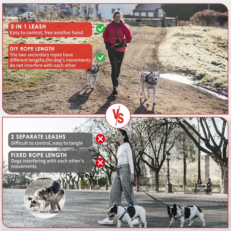 - 【No Tangle Design】:360° swivel clasp design allows for auto adjusting when dogs criss cross, no limtation for your dogs while moving from side to side without messing the leash.allowing your dogs to move freely around you.