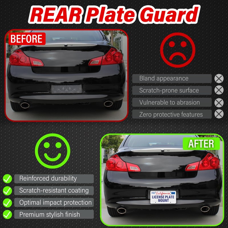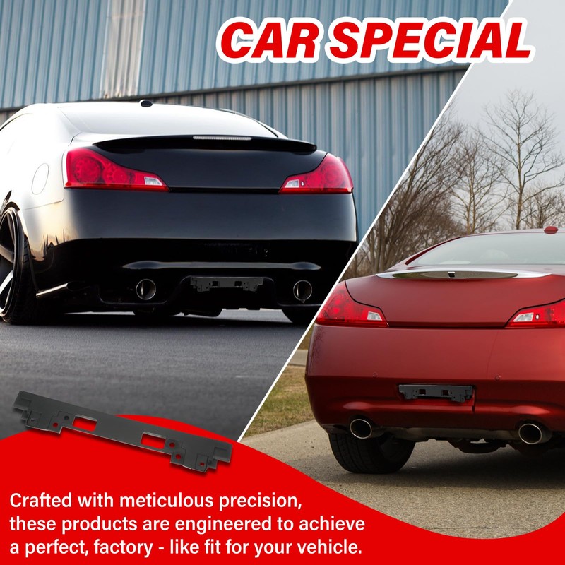 - PERFECT COMPATIBILITY:Our license plate holder and frame bracket are compatible with Rear Infiniti Q60 Q40 G25 G35 G37 Coupe Sedan 2007-2016, Precisely molded, it perfectly conforms to the curves of the vehicle's front bumper, eliminating the need for any adjustments during installation. The secure locking mechanism of the bracket ensures a rattle-free attachment, safeguarding both the license plate and the existing components of the vehicle.