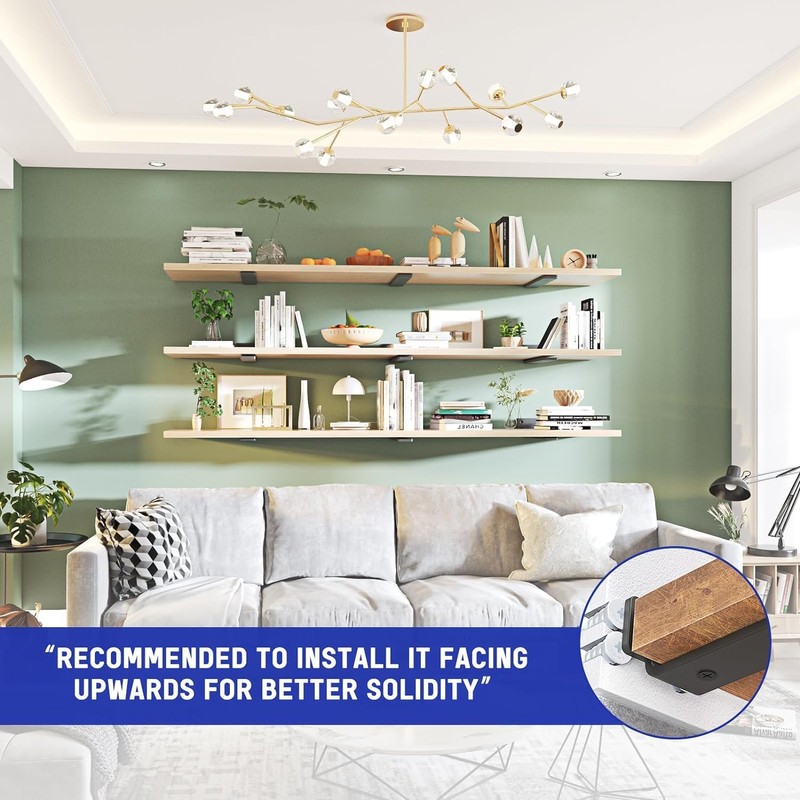 - 【Hidden & Countersunk Design】With a height of just 1.6 inches, the bracket can be easily hidden between the wall and shelf. It's designed for both upward & downward use, while the countersunk feature guarantees smooth drilling and invisible screws.