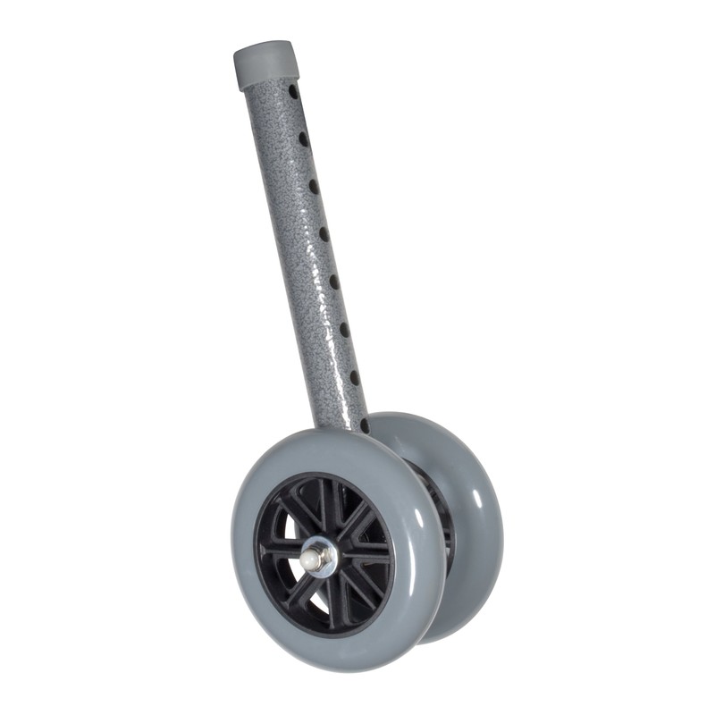The Drive Medical Bariatric Walker Wheels with Rear Glides comes with 5" caster wheels and two sets of rear glides. The rubber wheels allow most walkers to roll easily and smoothly over irregular surfaces, and the rear glide caps with covers allow for use on all surface.
