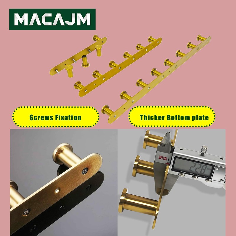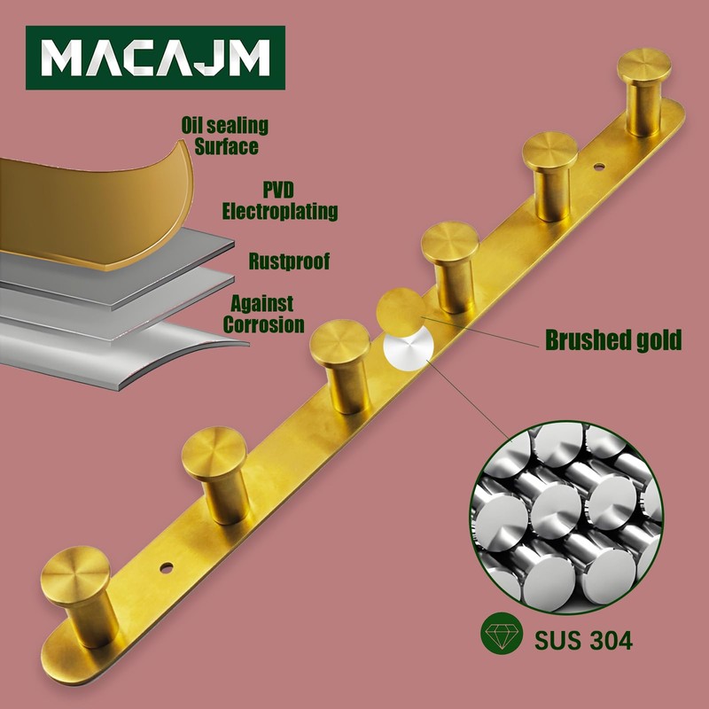- Premium Material:(2 Pack) Brushed gold coat rack wall mount with 6 hooks selected 100% 304 stainless steel,2mm thick bottom plate, gravity formed sturdy and durable,can withstand 35 pound, beautiful and durable without deformation,real material,visible quality, MACAJM is trustworthy.