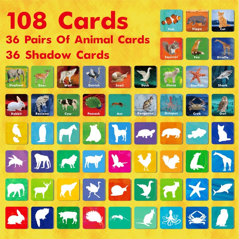- 108 PCS Matching Cards: It comes with 72pcs animal cards and 36pcs corresponding animal shadow cards, helping kids get familiar with wonderful animal world. There are three play methods, you can match the same animal cards, or match the animal card with its shadow cards or draw pictures on the back and make a new game by your imagination. Each card measures 2” X 2”.