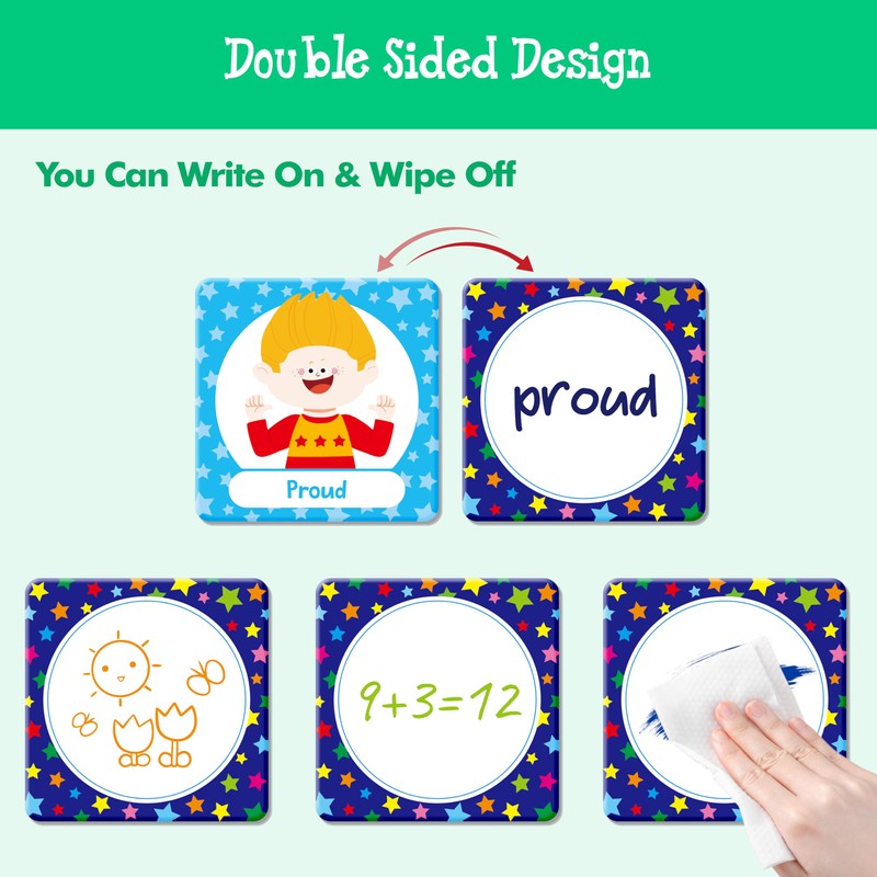 Including 72 PCS Matching Cards: It comes with 72pcs emotion matching cards, perfect for teaching kids about emotions and feelings. Double-sided design makes you have different ways to play. One side printed with vibrant patterns, another side is blank, you can draw pictures you want on it and make a new game by your imagination. Each card measures 2” X 2”.