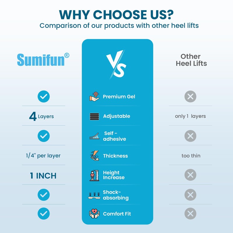 - CUSTOMER SERVICE - The package includes one pair of heel lifts for shoes. We offer a 30-day service guarantee for the Sumifun adjustable heel lift. If you are not satisfied with your purchase, please contact us for a full refund or replacement.