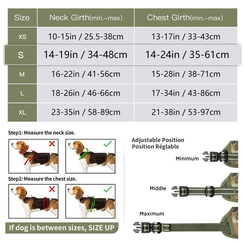- Easy to put on and take off - HEELE dog harness with adjustable chest strap and 2 quick release buckles to ensure your dog's safety and create a custom fit for your dog. Size XS: neck circumference 25.5-38cm, chest circumference 33-43cm. Size S: neck circumference 34-48cm, chest circumference 35-61cm. Size M: neck circumference 41-56cm, chest 38-71cm. Size L: neck circumference 46-66cm, chest 43-86cm. Size XL: neck circumference 58-89cm, chest circumference 53-97cm.