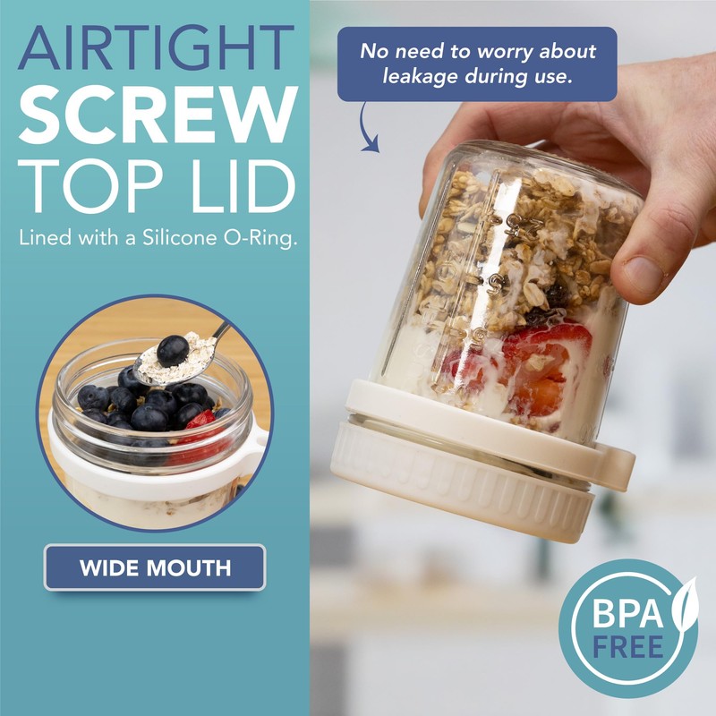 - LEAKPROOF & AIRTIGHT - Equipped with a secure seal, these overnight oat containers are leakproof, making them perfect for on-the-go mornings. Whether you're crafting the perfect chia seed pudding or overnight oats, these BPA-free glass jars for overnight oats have plastic, airtight lids, ensuring spill-free transportation. Each 350ml oats jar keeps your creations fresh and allows you to enjoy an extended shelf life.