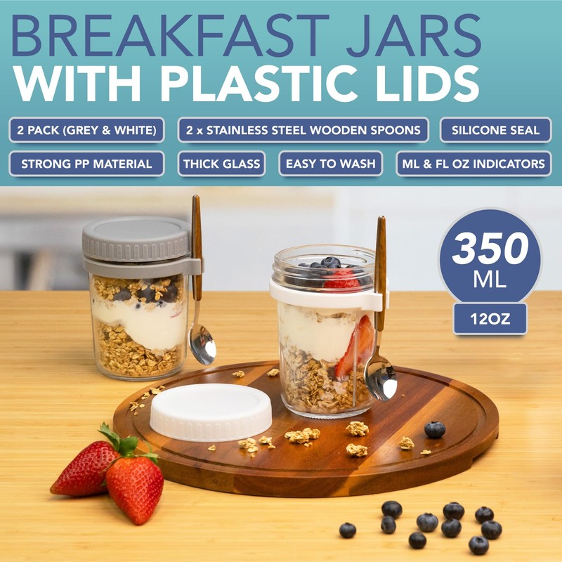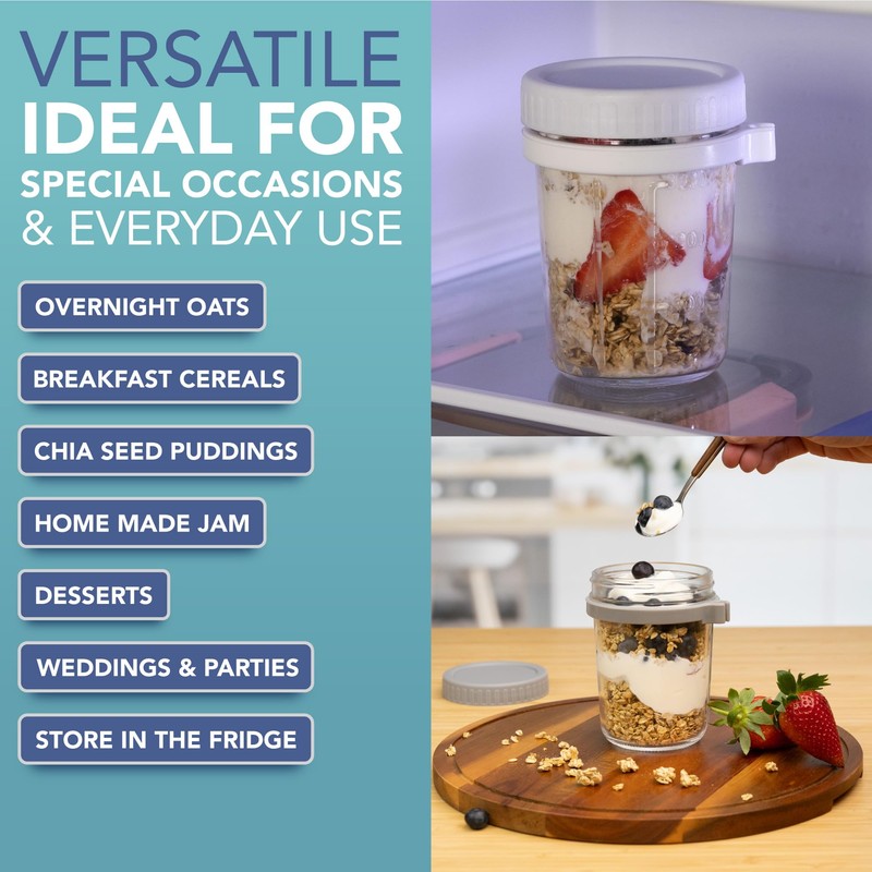 - WHAT'S INCLUDED - Delve into a realm of endless breakfast options with our Glass Overnight Oats Jars with Lids. Each yogurt pot accommodates 350ml/12oz of your preferred morning mix, complete with a stainless steel, wooden spoon, ideal for your journeys. With the incorporated rubber seal, rest assured your spoon stays snugly in place, always at the ready for your next morning pick-me-up.