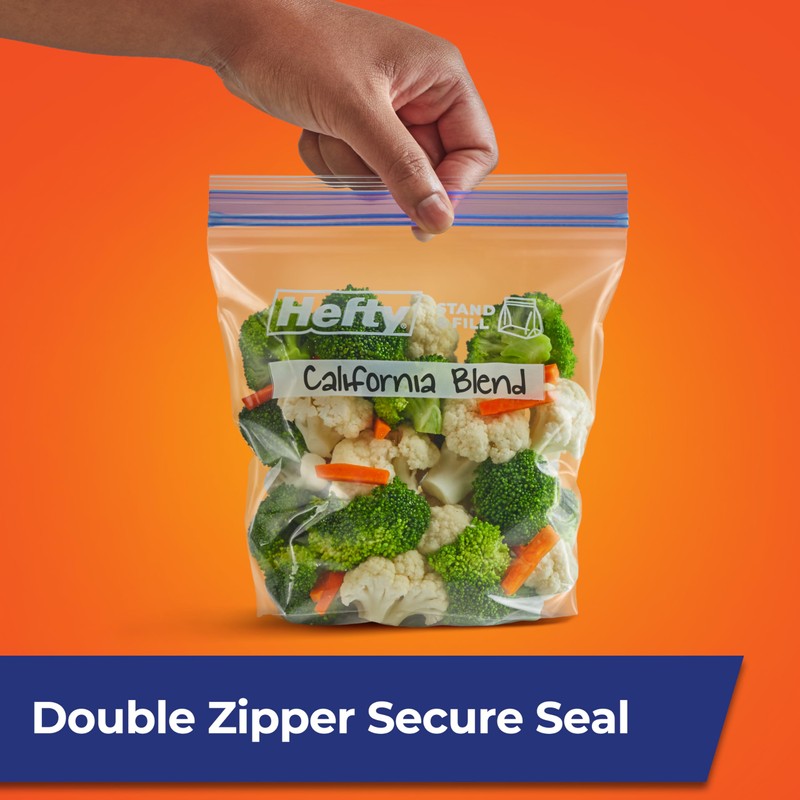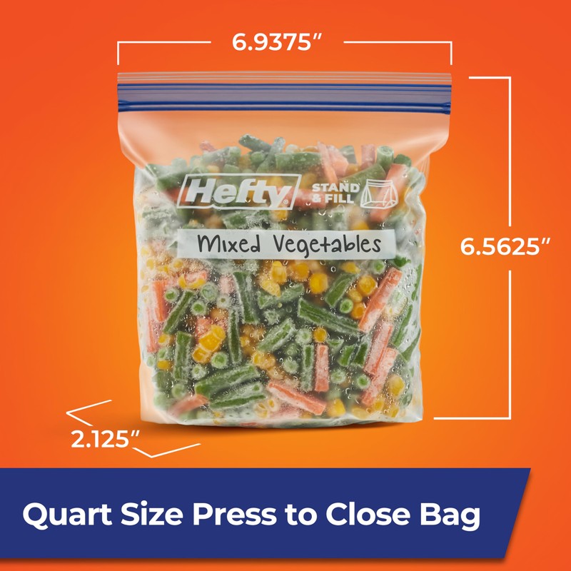 - Quart Size Plastic Freezer Bags: This pack includes 25 quart size, BPA-free, microwave-safe Hefty Press to Close Freezer Bags