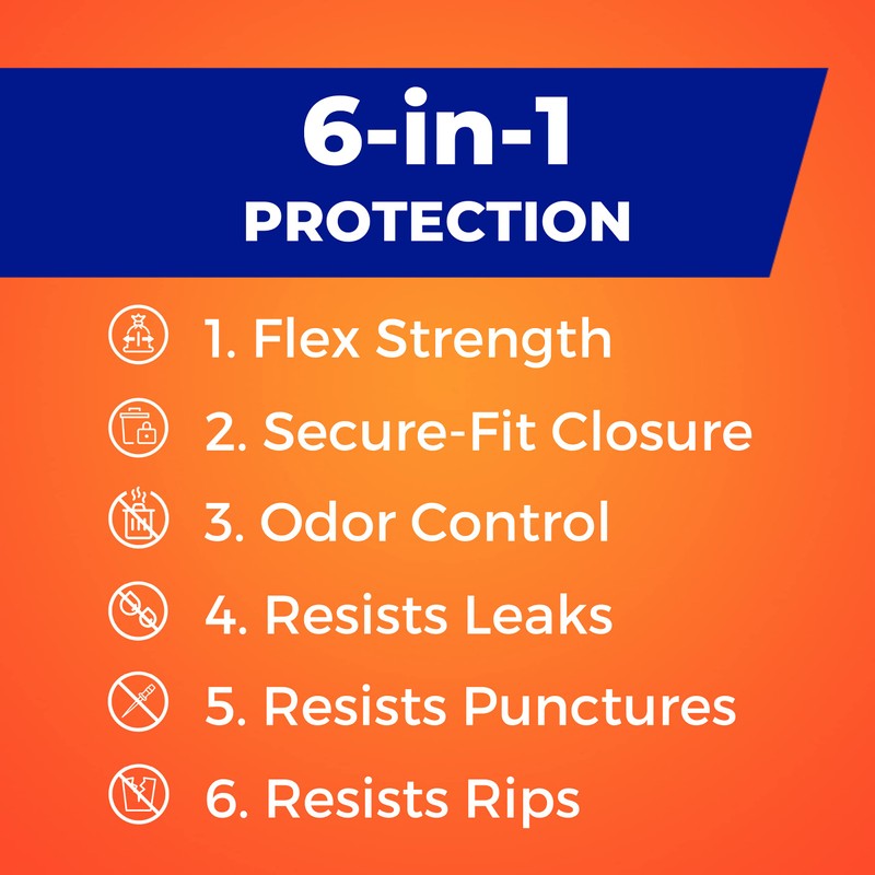 6-in-1 Protection: Features flex strength, tough drawstring, odor control, and resistance to leaks, punctures, and rips.