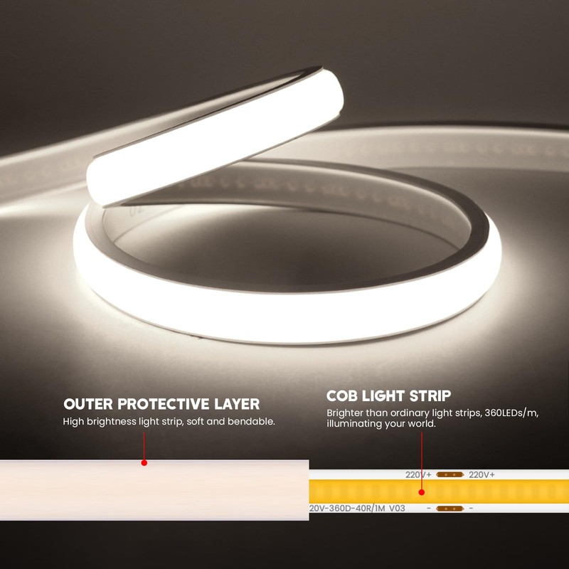 HEGEHE 230 V COB LED Strip, 288 LEDs/m Super Bright High Density IP65 Waterproof Flex COB LED Strip Light Strip for DIY Indoor and Outdoor Lighting Projects (White, 1 m)