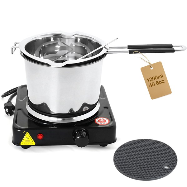 Hehinton Professional Double Boiler Melter Pot 1200ML/40.6OZ, 304 Stainless Steel Melting Pot with 1000W Electric Hot Plate, Multi-Functions Melting Pots for Wax Soap Base Chocolate Candy Cheese Butter