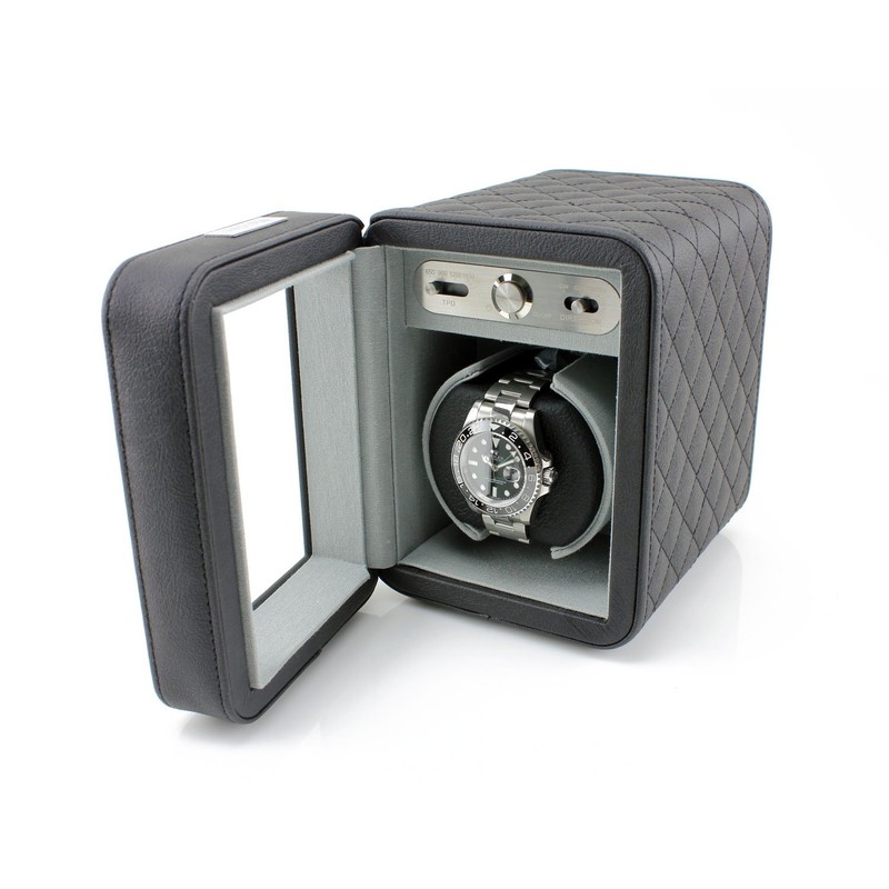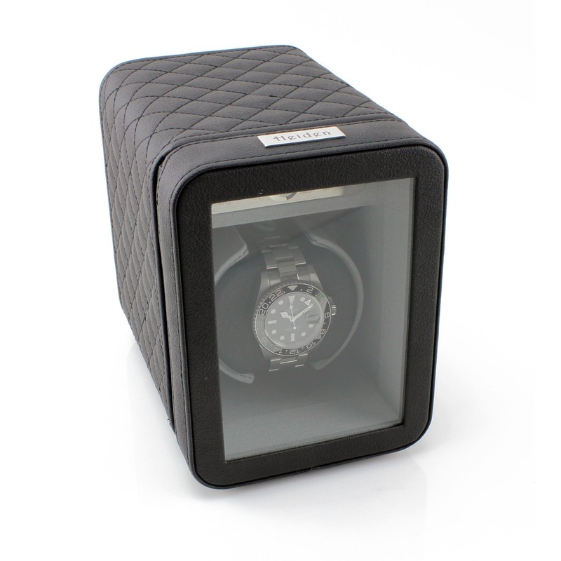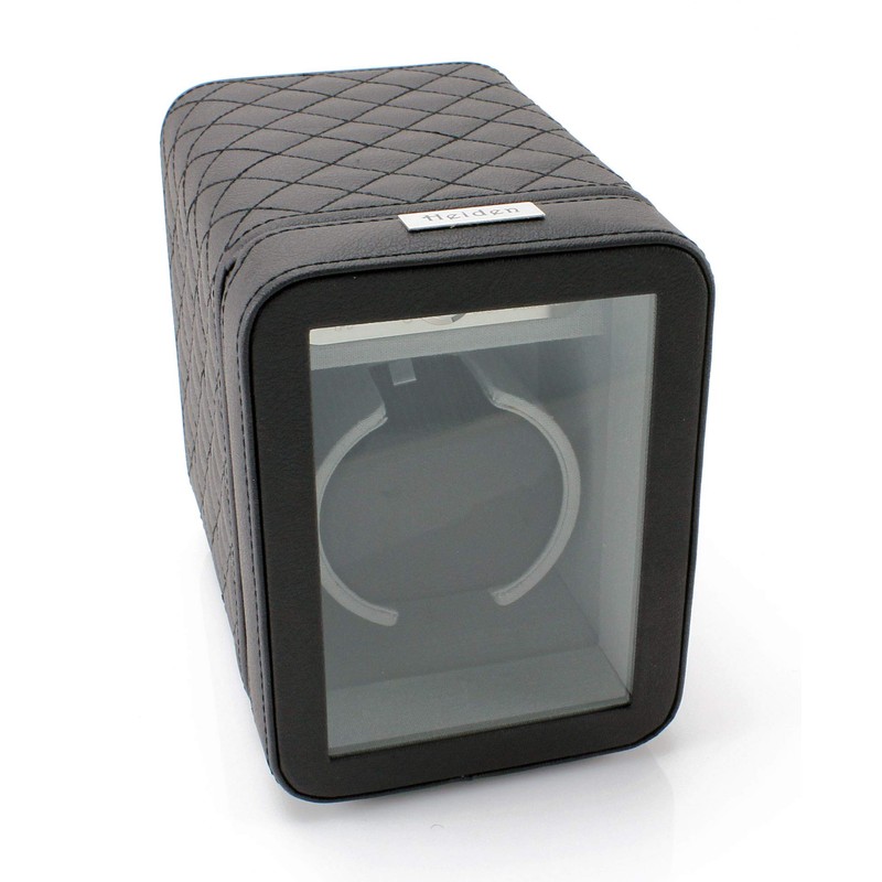 Heiden Monaco Single Watch Winder - Black Leather - Battery Powered or AC Adapter, 12 Program Settings, Diamond Stitched Vegan Leather, Soft Linen Interior, Large Interior Space for Large Watches