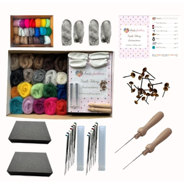 - 2 x 7 colour coded needle felting needles in 7 different gauges Tube of 10 pairs of glass eyes (glue in) A booklet with simple to follow instructions for six beginner projects