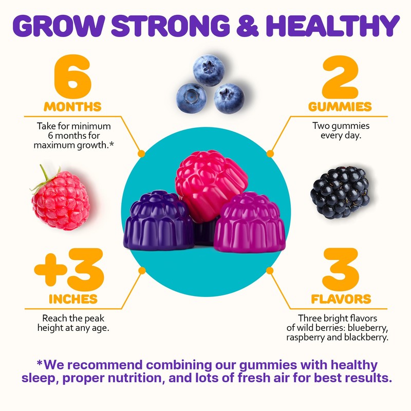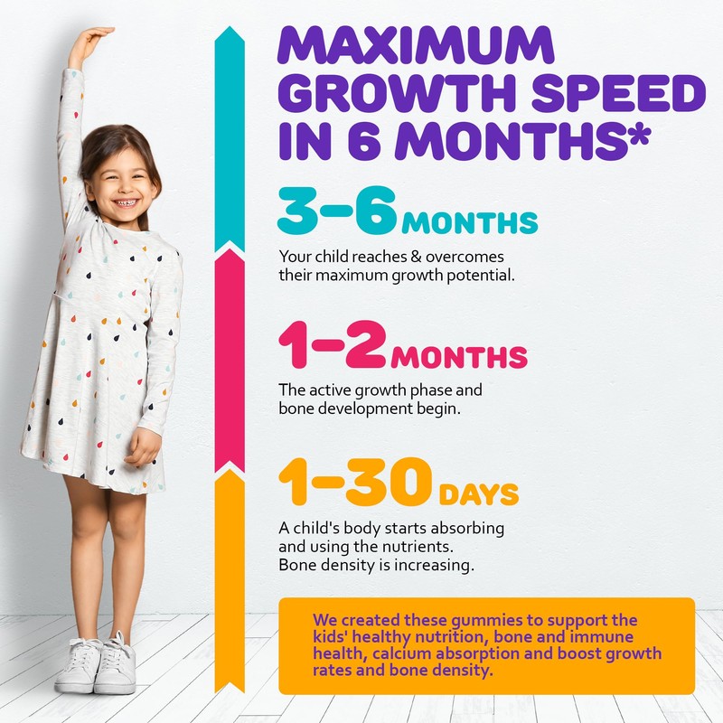 - Boost Height Growth for Kids Naturally - Looking for the height growth supplement for your child? Our Height Growth Gummies for Kids are crafted to support natural growth and development. Packed with essential growth vitamins, including Vitamin D, Calcium, and Zinc, these delicious gummies help enhance bone strength and promote healthy height growth. Perfect for children of all ages, our gummies help your child reach their full height potential in a safe and effective way.