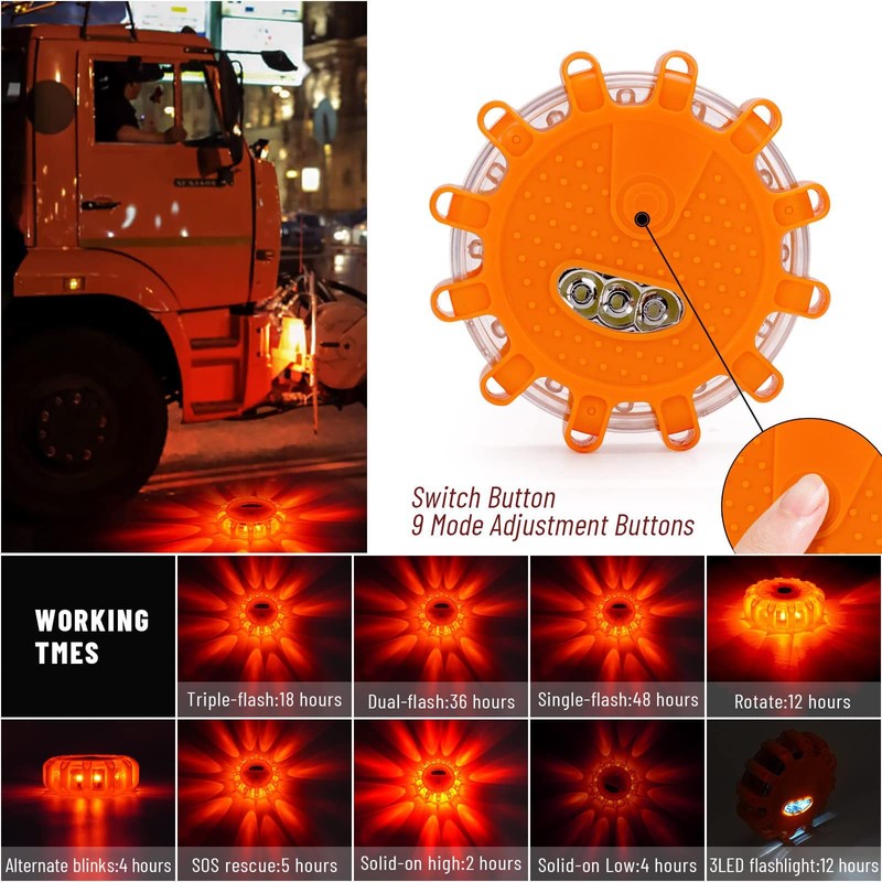 - đ„ ă9 Different Flashing Modesă Each LED Safety flare light has 9 flashing modes fast flash, slow flash, single flash, rotating flash, alternating flash, SOS, 3 led white light on top for different SOS rescue signals both for marine and road emergency use. It can be seen up to 1 mile at night and radiate outward 360 degrees to warn other drivers on the road to slow down and approach safely