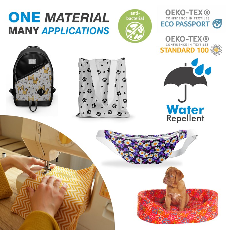 - Wasserabweisender Stoff ermöglicht verschiedene Einsetzungsmöglichkeiten in Innen- und Außenbereichen. Der Stoff ist sehr strapazierfähig, aber nicht zu steif, deswegen eignet er sich perfekt als Möbelstoff zum Beziehen von Gartenmöbeln, Stuhlhussen, Bootsabdeckungen, Hundekissen, Planen und verschiedenen Rucksäcken und Taschen.