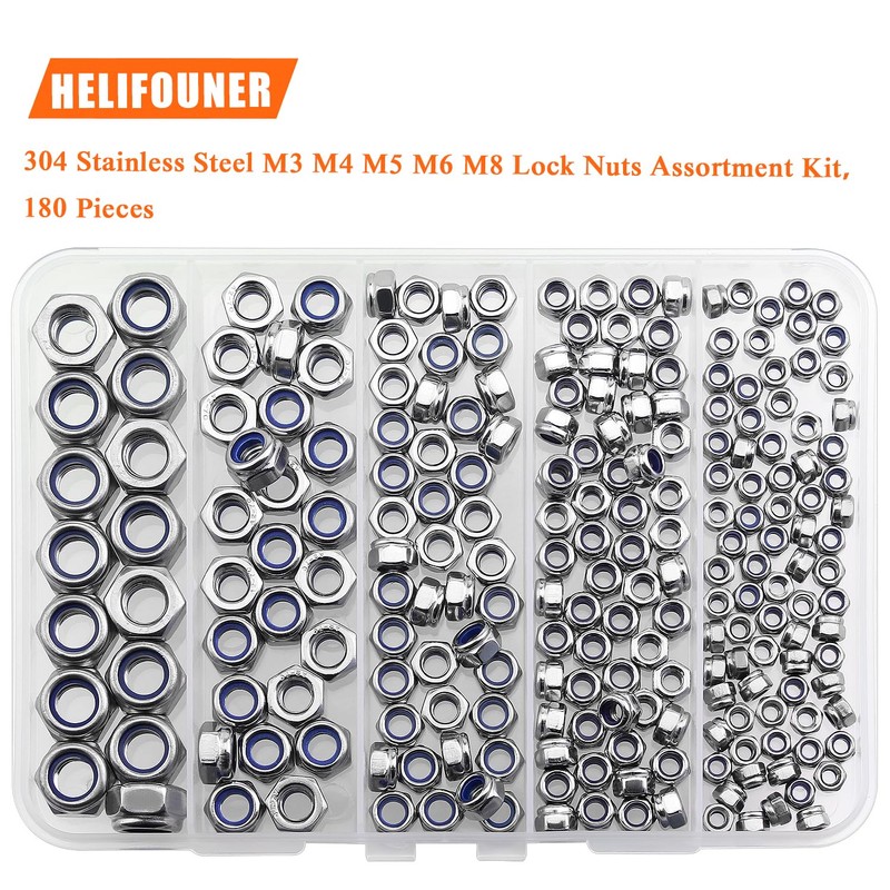 - 【Package Included】Total 180 pieces 5 sizes nylon insert lock nuts are packed in a durable transparent box with label. It is easy to distinguish the size, when you want to use a certain lock nut. Whenever you need us, please free to contact us, we will give you a professional service and reply you within 24 hours.