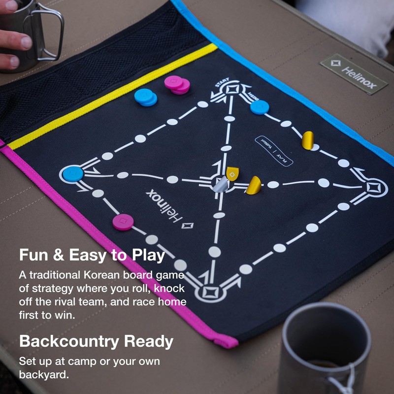 • Built with the same high-quality craftsmanship expected from Helinox; features a durable bluesign-certified 150D polyester game board, eight silicone mals (game markers), and four aluminium yuts (game sticks)