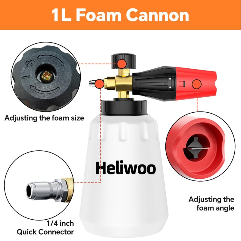 - 【Adjustable Snow Foam Cannon】Connect the 1/4" quick-connect plug to the high-pressure cleaning gun or rod to start cleaning. The snowflake sprayer can adjust the foam concentration and spray angle to improve the thick coverage of the foam. Specification: 1000 PSI to 3000 PSI. Container Capacity: 1 Liter / 0.22 Gallon.