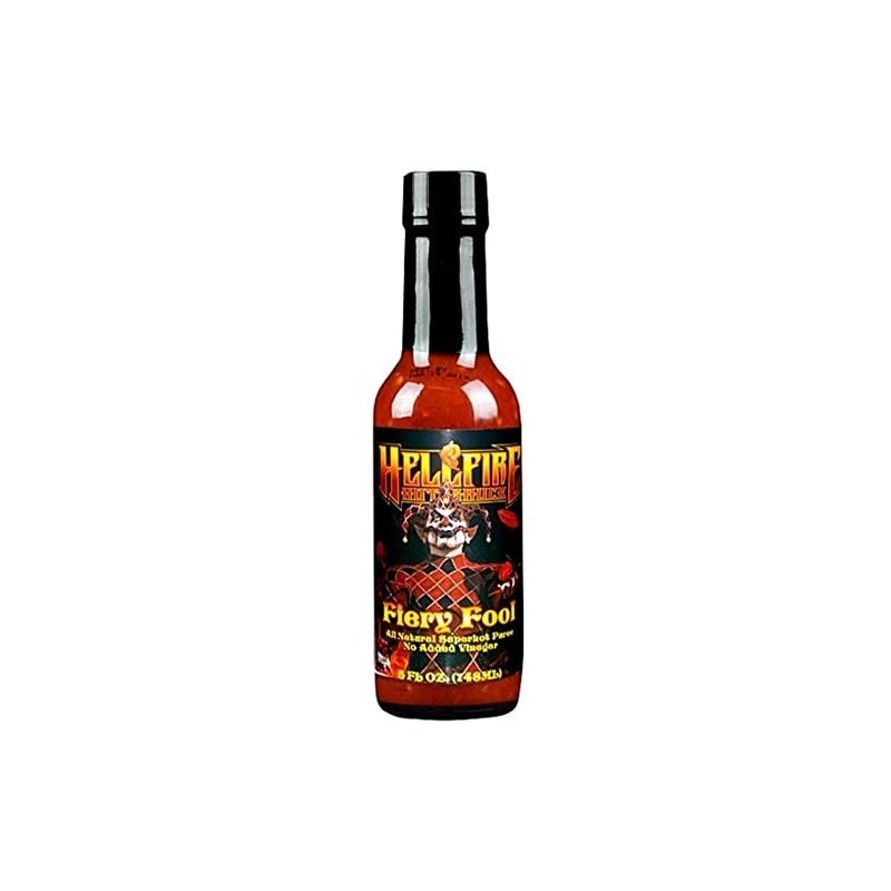 • Hellfire Hot Sauce's "Fiery Fool" is a very special and all-natural superhot puree that contains no added vinegar, low sodium and the hottest and most delicious peppers in the world: the Trinidad Scorpion, Caribbean Red, Carolina Reaper, Bhut Jolokia (Ghost), and Red 7-Pot Peppers! This sauce is sure to please the hardcore chilehead! The sauce is complemented with sun-dried tomatoes, garlic sea salt, and a splash of lemon juice.
