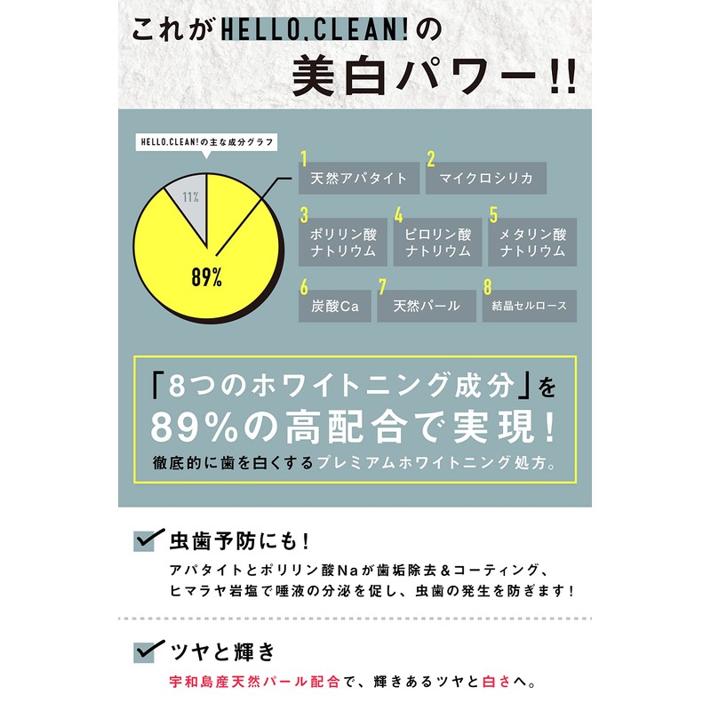 - 89% whitening ingredients to support teeth whitening. Unique formula lifts and adheres to strongly remove teeth stains. Apatite removes dental plaque that causes dull teeth, and it also removes apatite and sodium polyphosphate even the substances that cause breath odors. It also contains tea leaf extract and xylitol to keep your mouth healthy