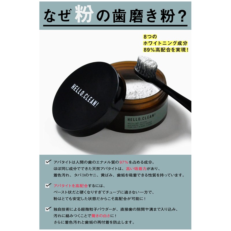 - The powder has been paid attention to detail. Natural apatite with a high whitening effect is highly adsorptive and has the ability to absorb stain, tobacco residue, yellow and tartar. For the high blend of apatite powder, paste will become too hard and clogged in the tube. So powder (powder) was the best choice for pollen The ultra-fine powder allows it to enter the gaps and grooves of the teeth and get tangled into the dirt to help whitening. You can also expect the effect of preventing dirt from re-attaching