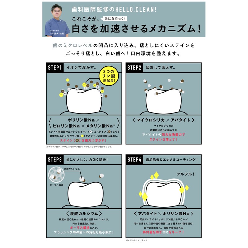 - (Supervised by a Dental Doctor) The ingredients are carefully selected from the idea phase of the teeth. Himalayan salt contains rich minerals to squeeze gumbs and prevent oral trouble. The pearl powder (pearl powder) is made from the pearl of Akoya shellfish produced in Uwashima, Ehime Prefecture, which gives the teeth luster through brushing